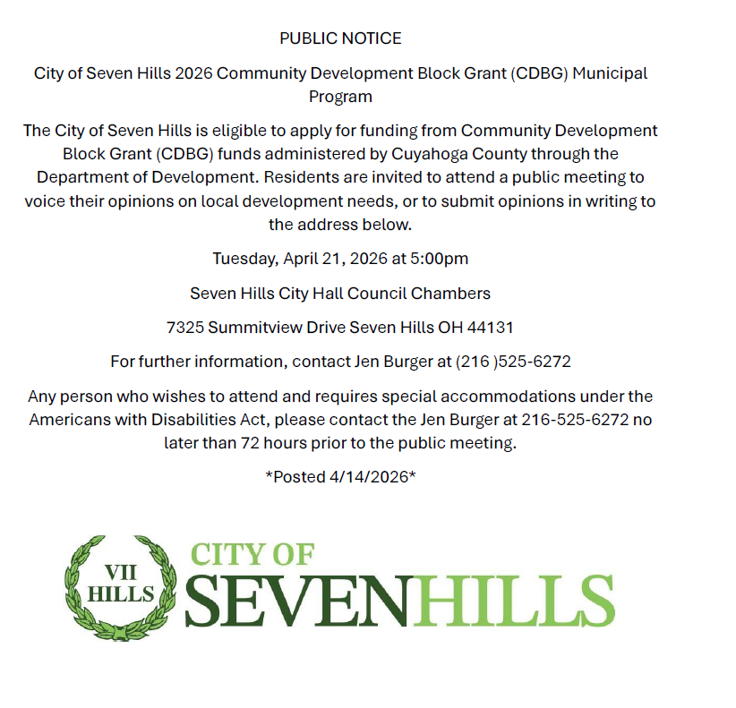Public Meeting Notice for April 21st - 5pm at Seven Hills City Hall. Those with specific needs, contact Jen Burger 216.525.6272. Posted 4/14. Image of City of Seven Hills Crest and Logo