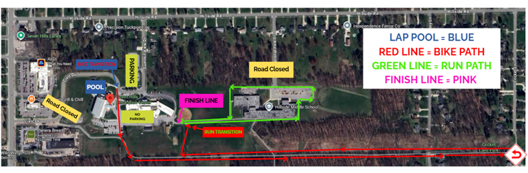 Through the course, there will be water stations by the swim to bike transition and in the Hillside parking lot area for the run portion of the race.
